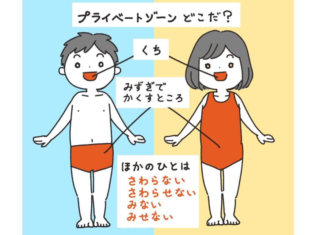 ・水着で隠す体の部分や、特に女の子の場合、下着も見られたり触られたりしてはいけない「プライベートゾーン」であることを、入浴や着替えのときに伝える