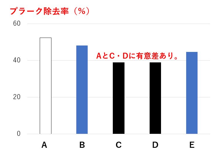 図2は2021年に日本歯科大学のグループが行った研究結果ですが、異なる形や大きさの歯ブラシで歯垢(プラーク)の除去率を比較したところ、統計学に有意の差があることが明らかにされています。