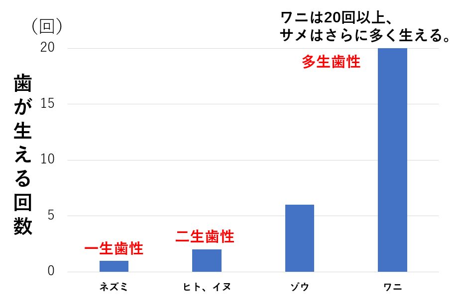 また、歯の生えかわる回数も動物によって違い、1回だけ生えかわるヒトは「二生歯性」ですが、サメは何度も生えかわる「多生歯性」です(図2)。