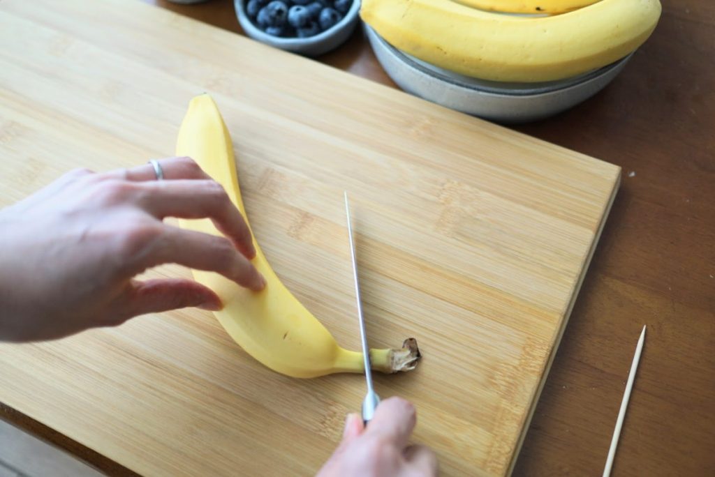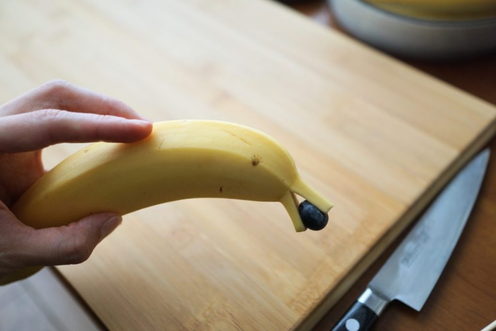 6. グラスに飾るために、バナナいるかの下を1/3くらい切ります。