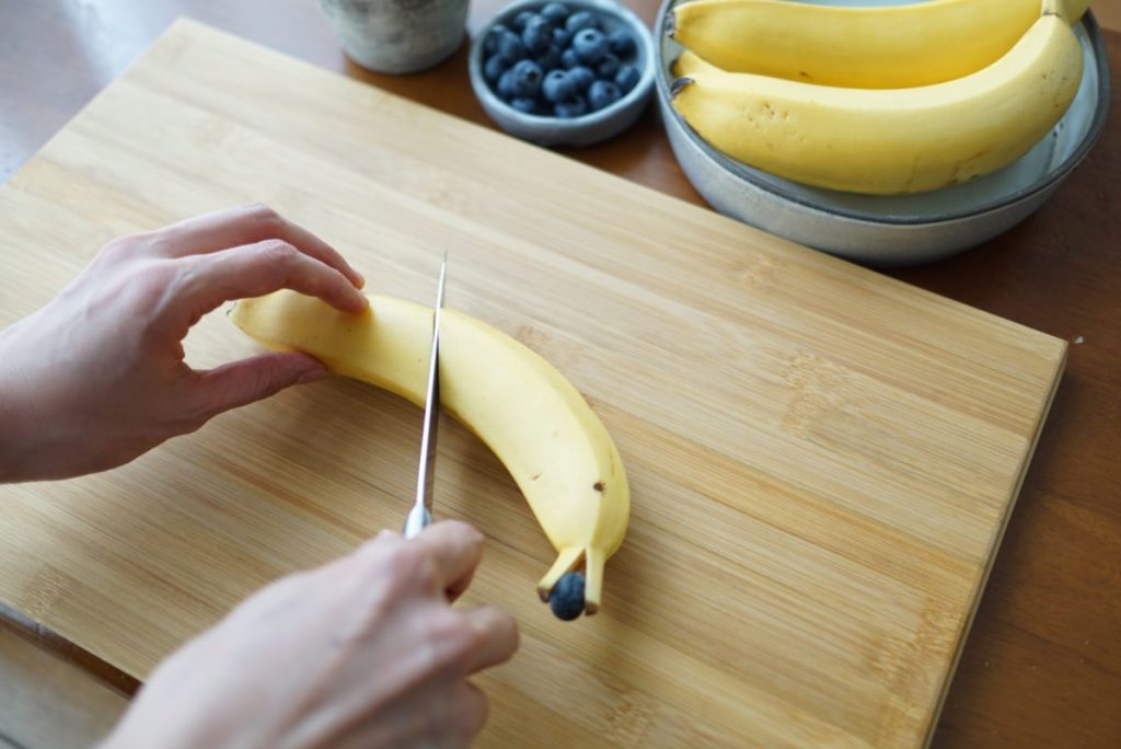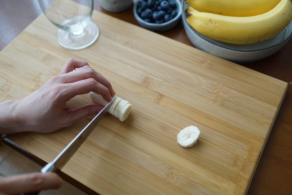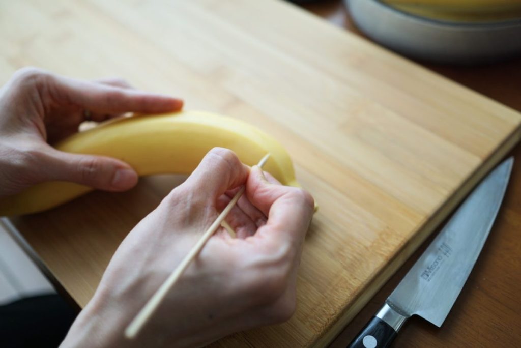 7. 先ほど切った下1/3のバナナの皮をむき、3mmくらいにスライスします。(グラスに飾る用)