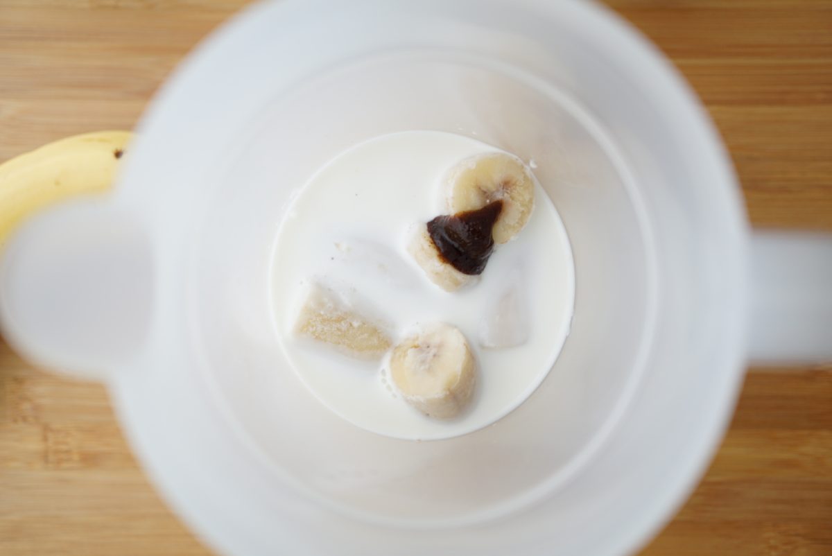 5. バナナスムージーを作ります。バナナスムージーの材料(冷凍バナナ1本、牛乳130ml、レモン果汁 小さじ1/4、あればバニラペースト小さじ1/4)を全て入れて、滑らかになるまでミキサーにかけます