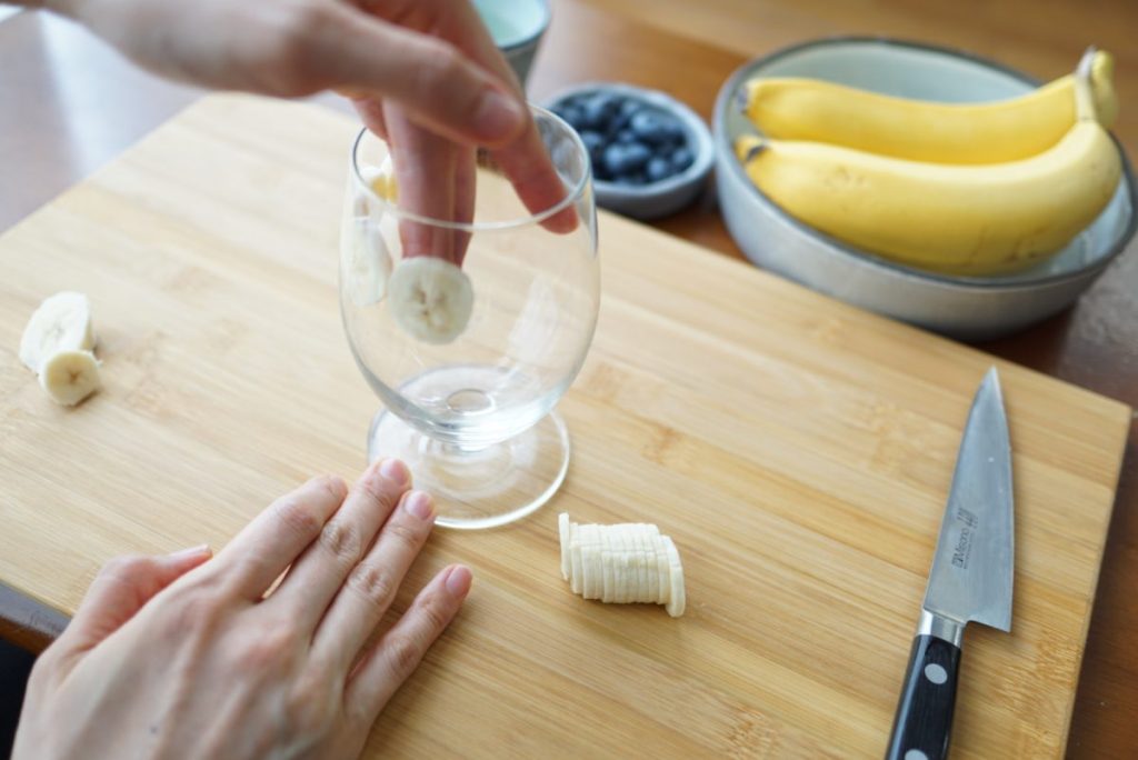 8. グラスの内側に、スライスしたバナナを貼り付けます。