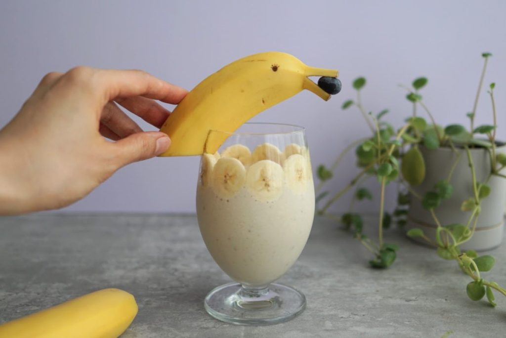 9. バナナスムージーを注ぎ、バナナいるかを飾って、完成!