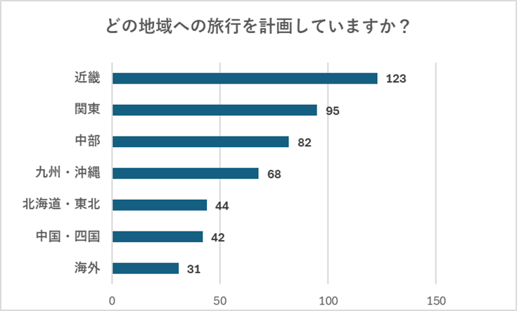 アンケートで聞いてみると、1位「近畿地方」、2位「関東地方」、3位「中部地方」という結果となり、海外は少なめという結果に。
