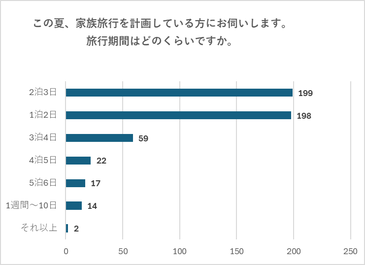 「2泊3日」は移動や観光にほどよい余裕があり、家族全員が疲れすぎずに楽しめる一方で、「1泊2日」は週末を利用するなど日程の調整がしやすく、気軽に出かけられる点が魅力的です。
