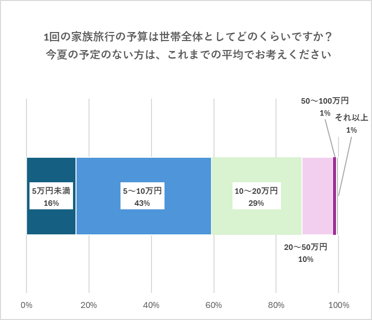 家族旅行の1世帯あたりの旅行予算を聞いてみると、もっとも多かった回答は「5万〜10万円」、次に「10万〜20万円」が続く結果となりました。