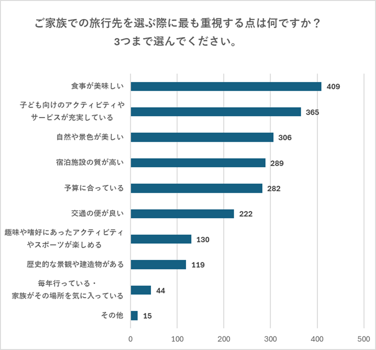 アンケートの結果では、「食事がおいしいこと」「子ども向けのアクティビティやサービスが充実していること」「自然や景色が美しいこと」の3つが多く挙がりました。