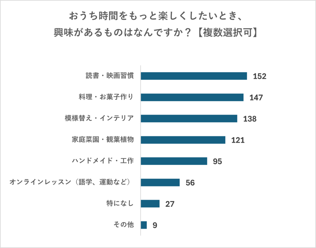 最後に、「おうち時間をもっと楽しくしたいとき、興味があるもの」を聞いたところ、「読書・映画習慣」がもっとも多くあがり、次に「料理・お菓子づくり」が続く結果となりました。