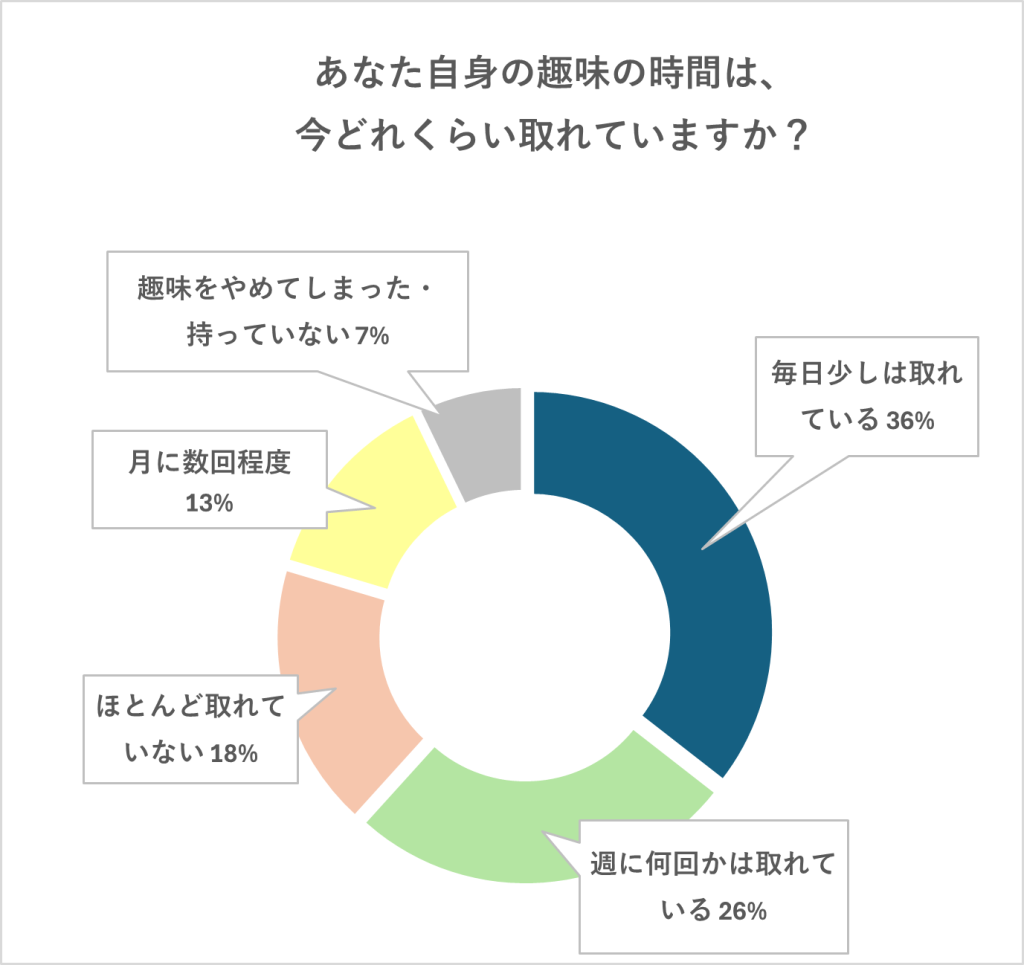 一方で、「ほとんど取れていない」と回答した人も18%おり、思うように趣味の時間がとれていない現実も浮かびあがっています。