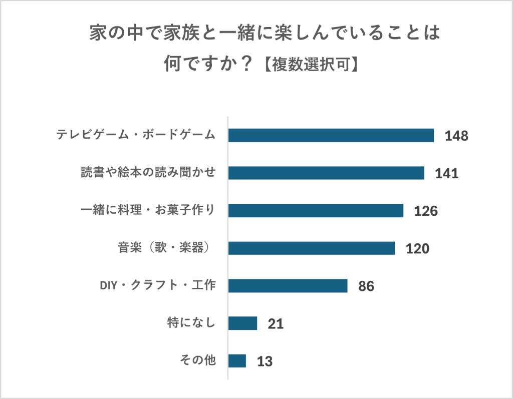 まず、アンケートで「家の中で家族と一緒に楽しんでいること」を聞いたところ、もっとも多かったのは「テレビゲーム・ボードゲーム」の回答でした。デジタル・アナログを問わず、親子で一緒に盛り上がれる遊びが人気を集めているようです。