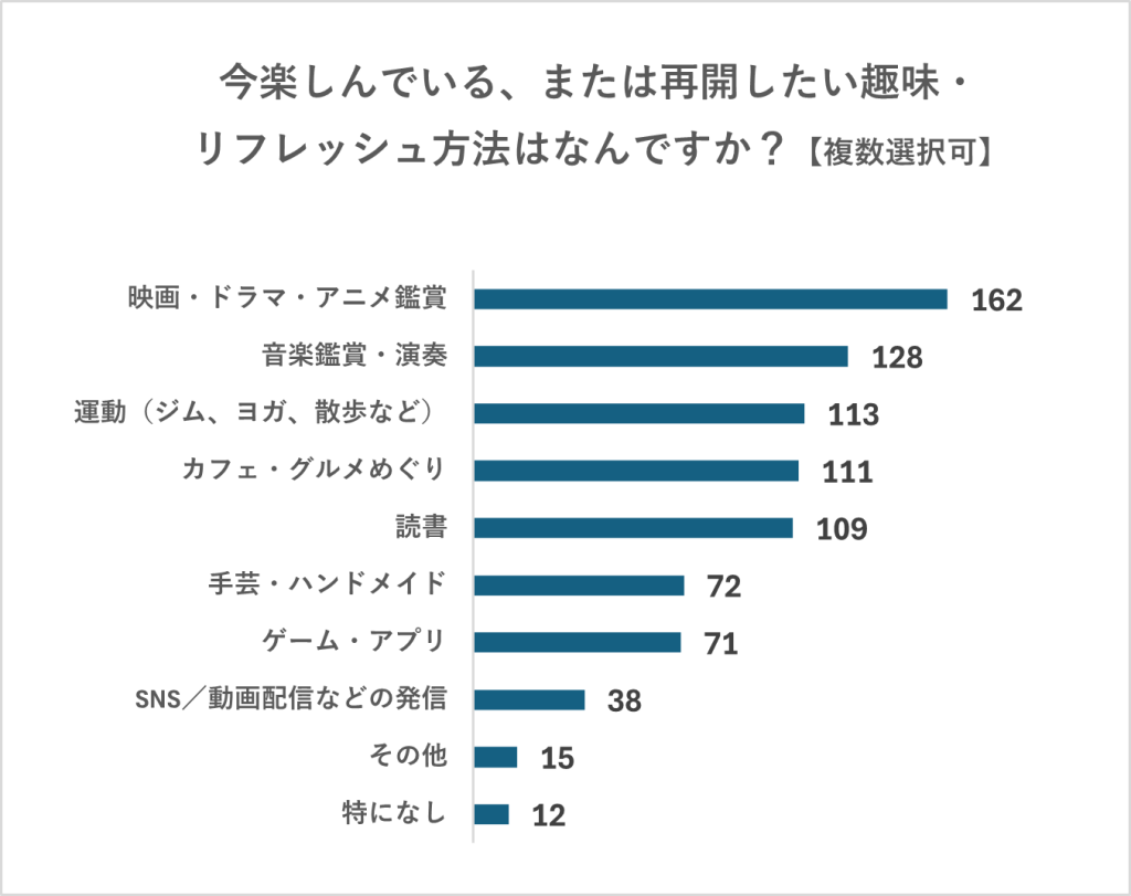 「今楽しんでいる、または再開したい趣味」を聞いてみると、1位にあがったのは「映画・ドラマ・アニメ鑑賞」。配信サービスの充実もあり、子どもが寝た後にもおうちで気軽に楽しむことができる点が魅力的です。