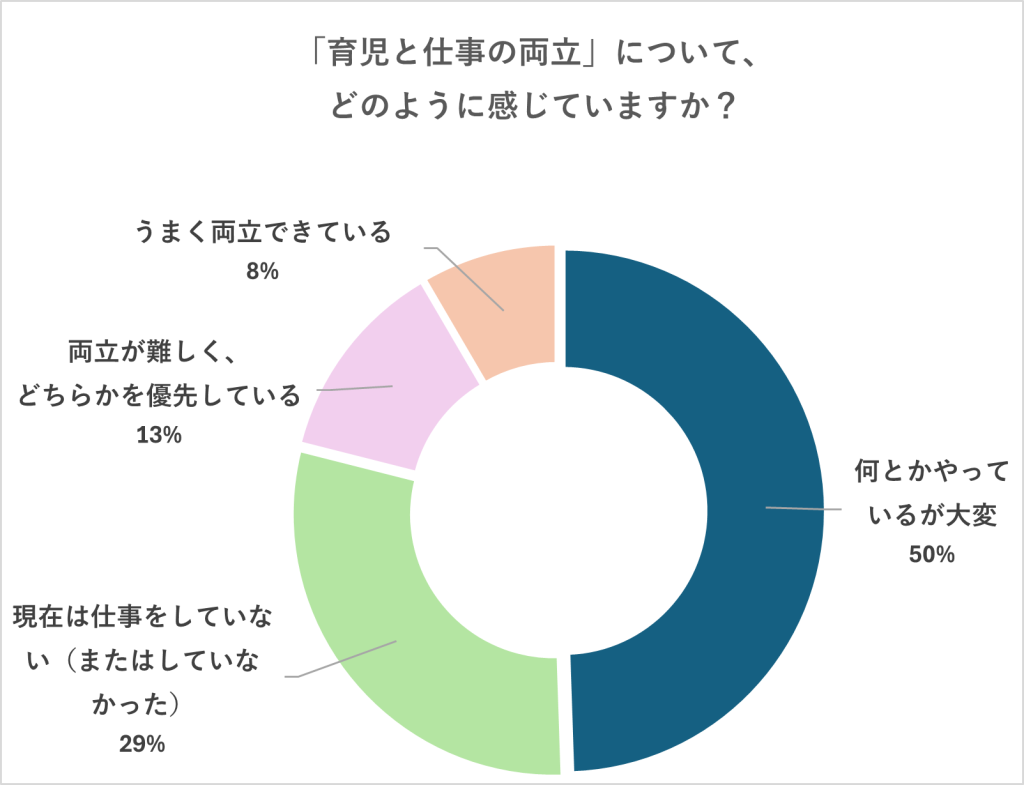 「仕事と育児の両立」については「何とかやっているが大変」が最多で、全体の約半数にのぼりました。