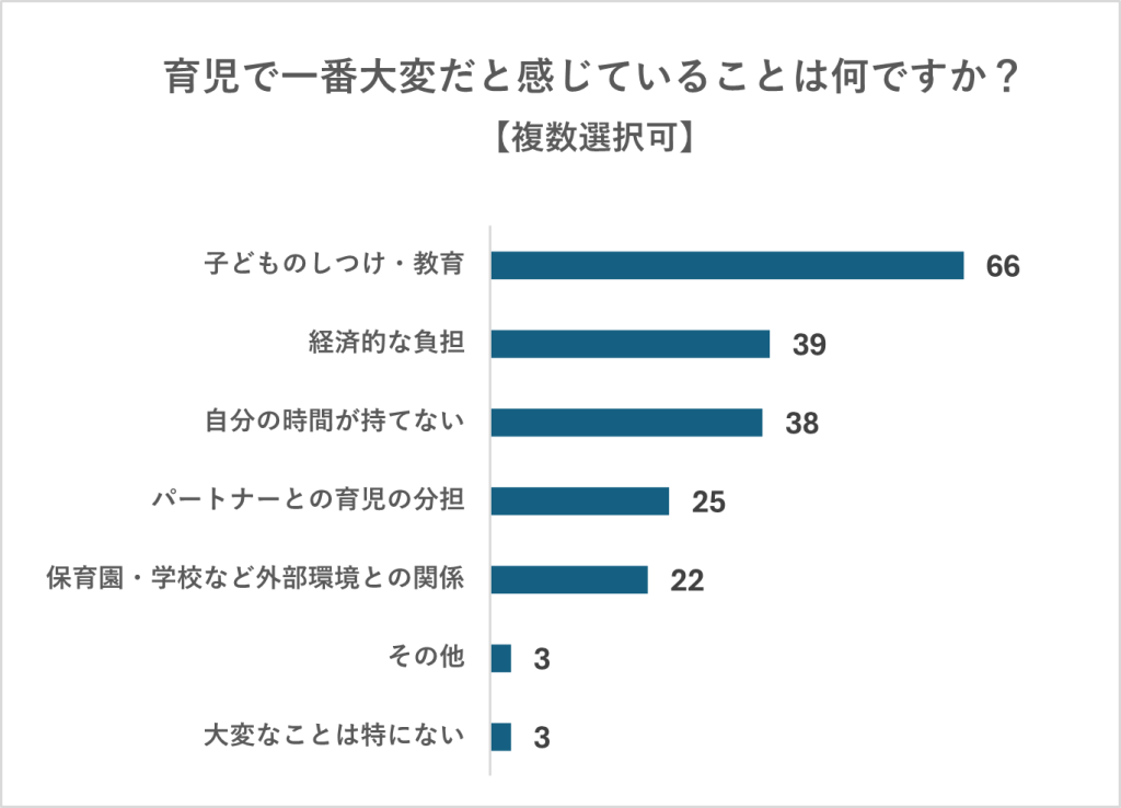 こうして見ると、育児における三大悩みは「しつけ」「お金」「時間」。多くの親たちが、日々立ち向かっている壁であることが見えてきます。