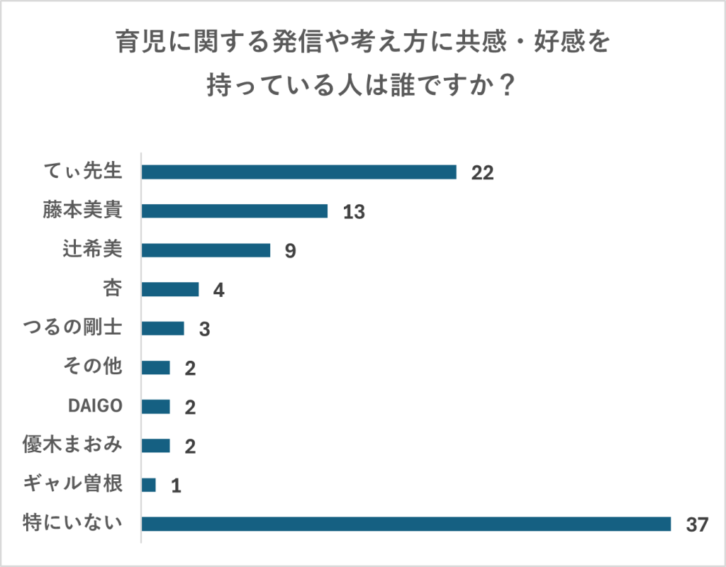 「育児に関する発信や考え方に共感・好感を持っている人」についても聞いてみたところ、「てぃ先生」、そして「藤本美貴さん」の名前が多くあがりました。