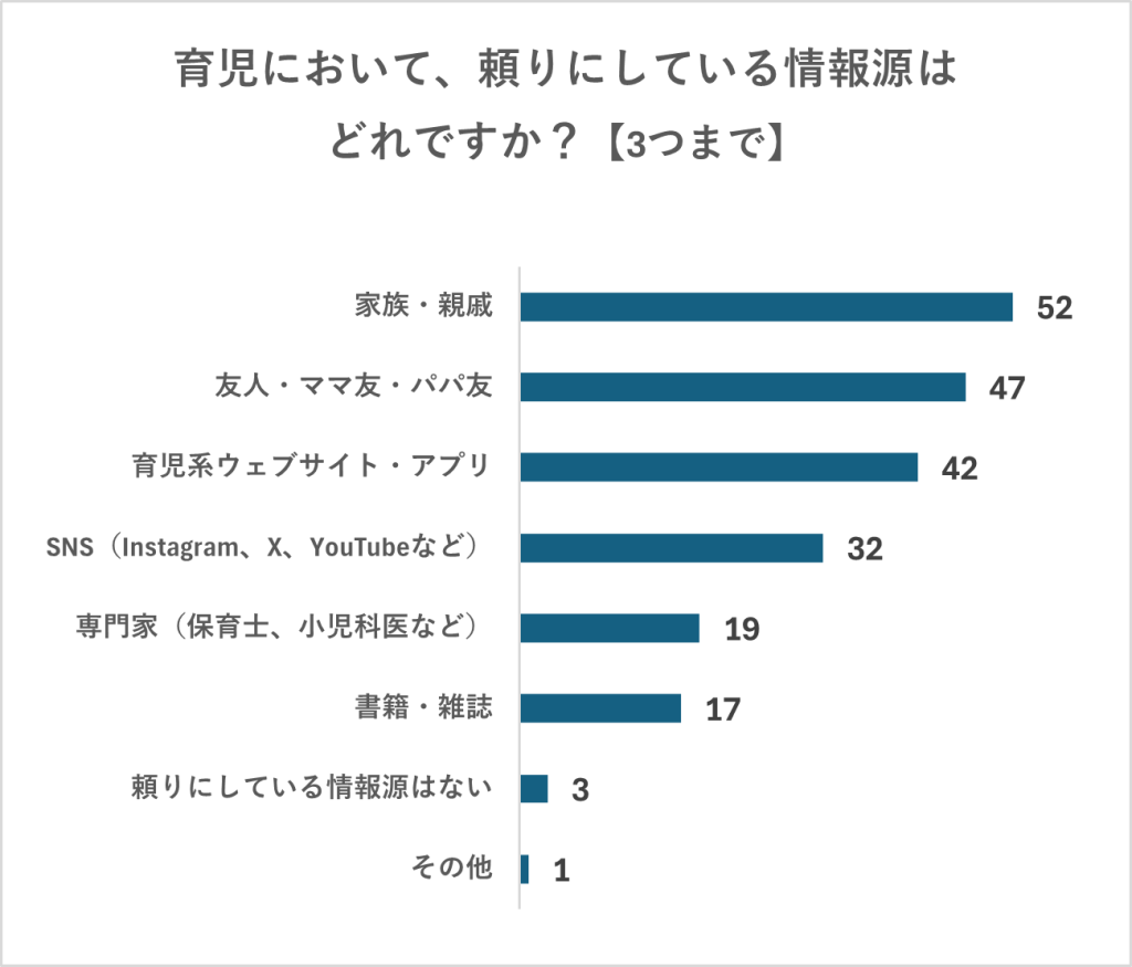 アンケートでもっとも多かったのは「家族・親戚」、次いで「友人・ママ友・パパ友」、「育児系ウェブサイト・アプリ」という結果となりました。