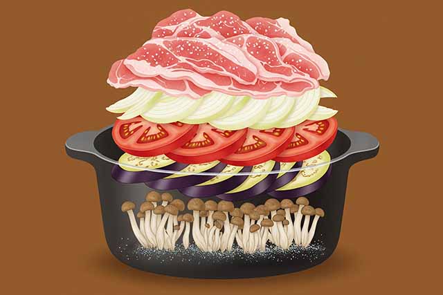 野菜と肉の性質を活かし、順番に重ねて煮るだけで、素材のうま味と栄養を引き出せる調理法ですよ。一度にまとめて加熱できるので、暑い季節でも無理なく続けられます。