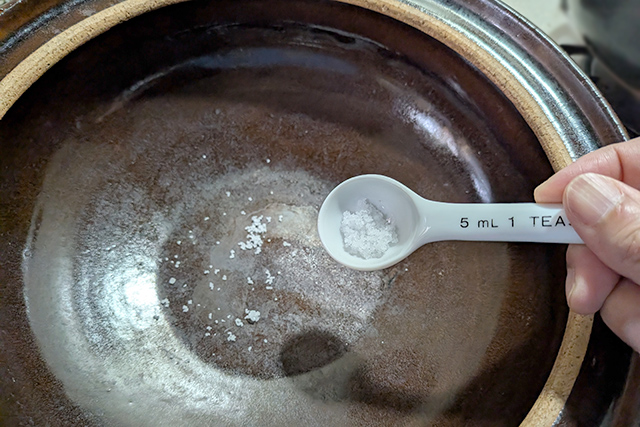 【1】無水調理ができる鍋を用意します。最初に、鍋底に小さじ1/4の塩をまきます。