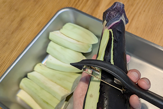 ナスは、半分の長さに切ってから、縦向けの薄切りにします。