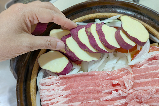 鍋の空いたスペースに、さつまいもを入れて、蒸し野菜も一緒に作りましょう。