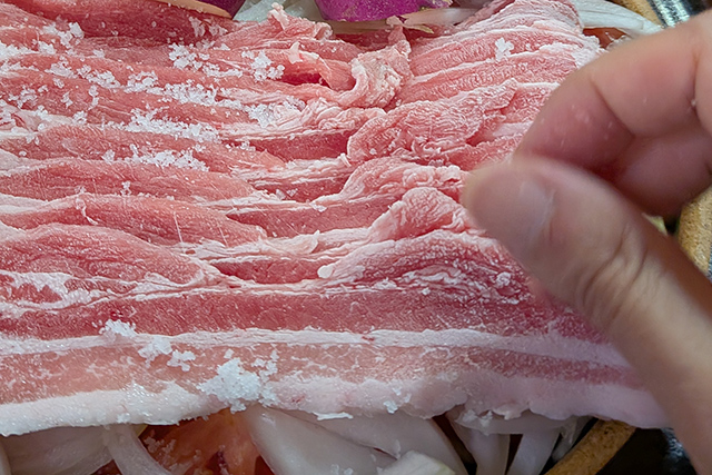 【3】下から、しめじ→ナス→トマト→玉ねぎ→豚肉の順で食材を重ねます。