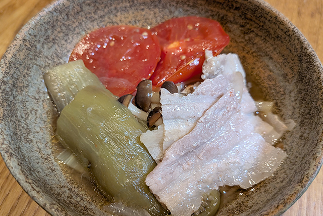 鍋に、陰性の野菜(トマトやナスなど)から入れて、順番に陽性の食材(根菜類)を重ねて煮ることで、野菜の旨味を引き出す特徴があります。
