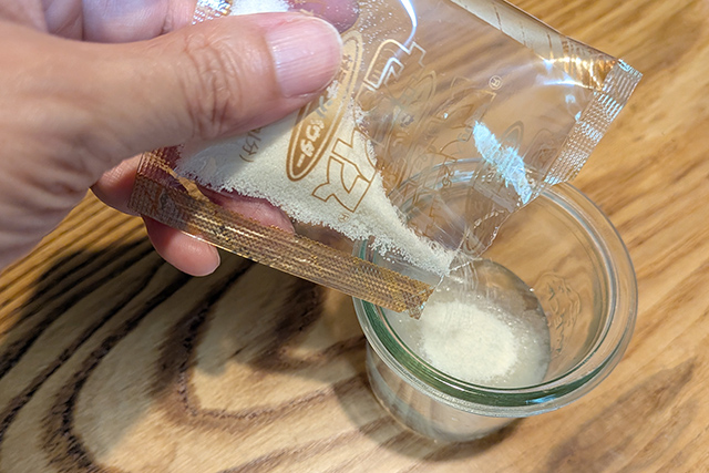 【2】ふやけたら、そのまま電子レンジ(600W)で約20〜30秒加熱し、ゼラチンを完全に溶かします。