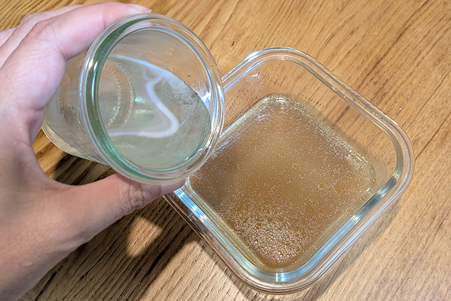 【4】そこに溶かしたゼラチン液を加えてさらに混ぜ、平らな耐熱容器(バットや保存容器など)に流し入れます。