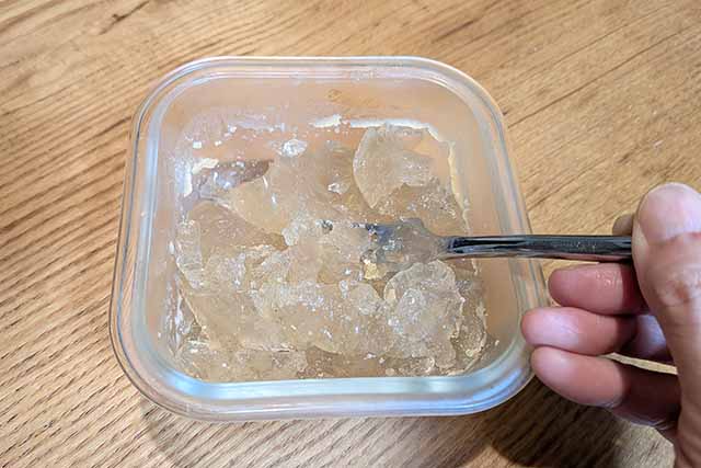 【5】粗熱がとれたら冷蔵庫に入れ、1〜2時間冷やします。ジュレ状に固まったら、フォークなどでほぐします。