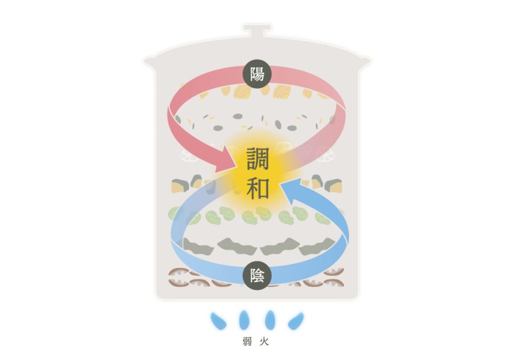 野菜と肉を順番に重ねて煮る「陰陽煮」は、「重ね煮」とも呼ばれ、食材の陰陽バランスを考慮した調理法として知られています。