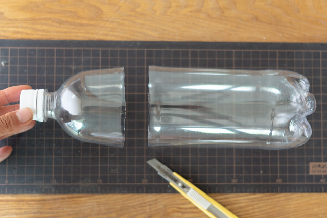 1. 土や生ごみを入れやすくするため、最初にペットボトルの上部を10cmほどカットし、ずんどうにします。