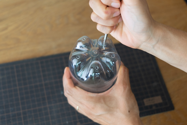 2. ペットボトルの底に、千枚通しで穴を開けます。