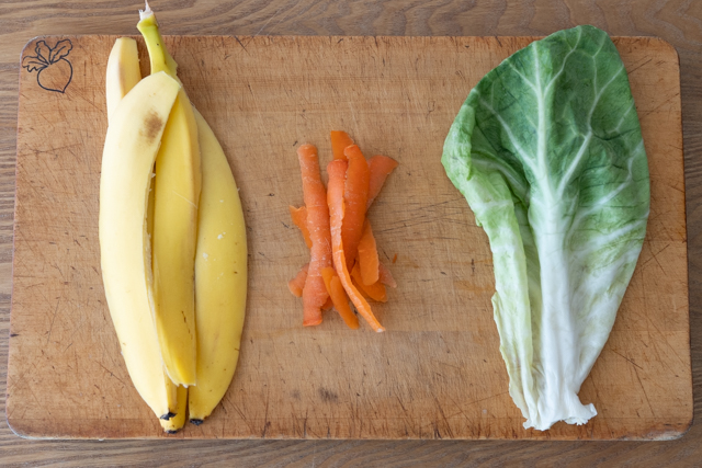 3. 分解の様子を観察する、くず野菜を用意します。今回は、バナナの皮・にんじんの皮・キャベツの外葉を用意しました。