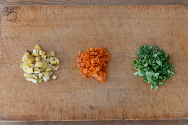 4. 分解が進みやすくするために、用意した生ごみを5mm四方くらいの大きさに細かくカットします。
