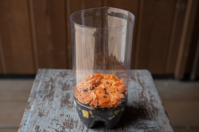 8. 次に、1cmほどの層になるように、にんじんの皮を入れました。