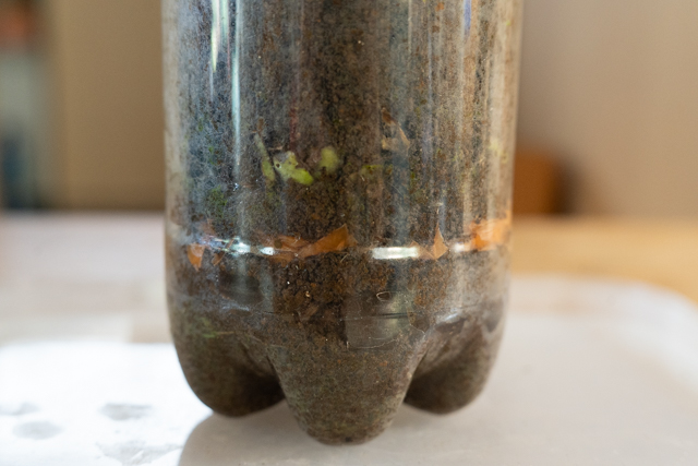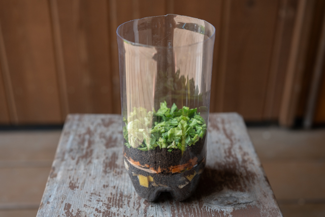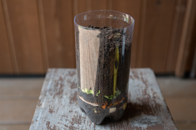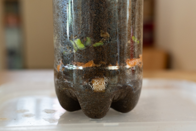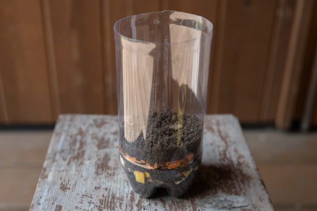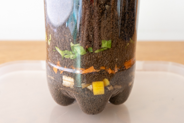 ペットボトルで透明なコンポストを作ってみると、野菜などのカラフルな生ゴミが、土の中の菌類の力で少しずつ分解されていく様子を観察することができます。
