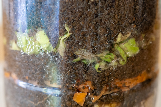 4. 6日目。糸状菌が正面にも広がってきました。キャベツとバナナはだんだんと黒くなり、分解されています。