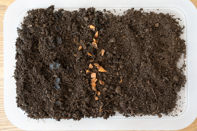 1.トレイに土を出し、中の生ごみの様子を観察してみます。生ごみが腐敗せず、菌類の力で分解されていると、土のいい香りがふわっと広がります。