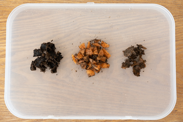 3. 割り箸で、分解されていない生ごみを集めてみました。左から、バナナの皮・にんじんの皮・キャベツの外葉です。バナナとキャベツは、黒っぽく変色し、薄くペラペラになり、量も減っています。