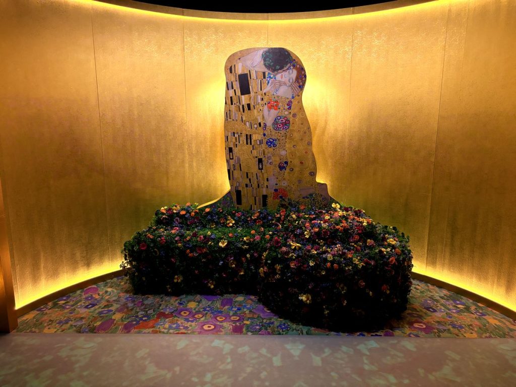 会場にはクリムトの黄金の世界に入り込んで撮影できるフォトロケーションも用意されています。部屋は2つあり、1つ目の部屋を抜けた先にはクリムトの作品としてまず名前が挙がる「接吻」を立体物にし、美しい花に囲まれたフォトスポットも用意。メインフロアを楽しむのに夢中になってしまい、こちらを訪れるのをお忘れなく。
