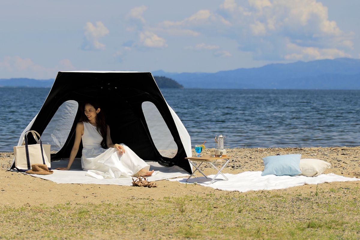 「COCOON」と「HEIDI」は、ともに”まっしろ”で洗練されたデザインが特徴的なアイテム。公園やビーチ、キャンプ場などでひときわ目を引く存在感で、SNS映えも間違いなしです。「COCOON」の中に「HEIDI」を敷いて使えば、日差しを避けながらも快適な空間で、大切な人との時間をより特別なものにしてくれるでしょう。