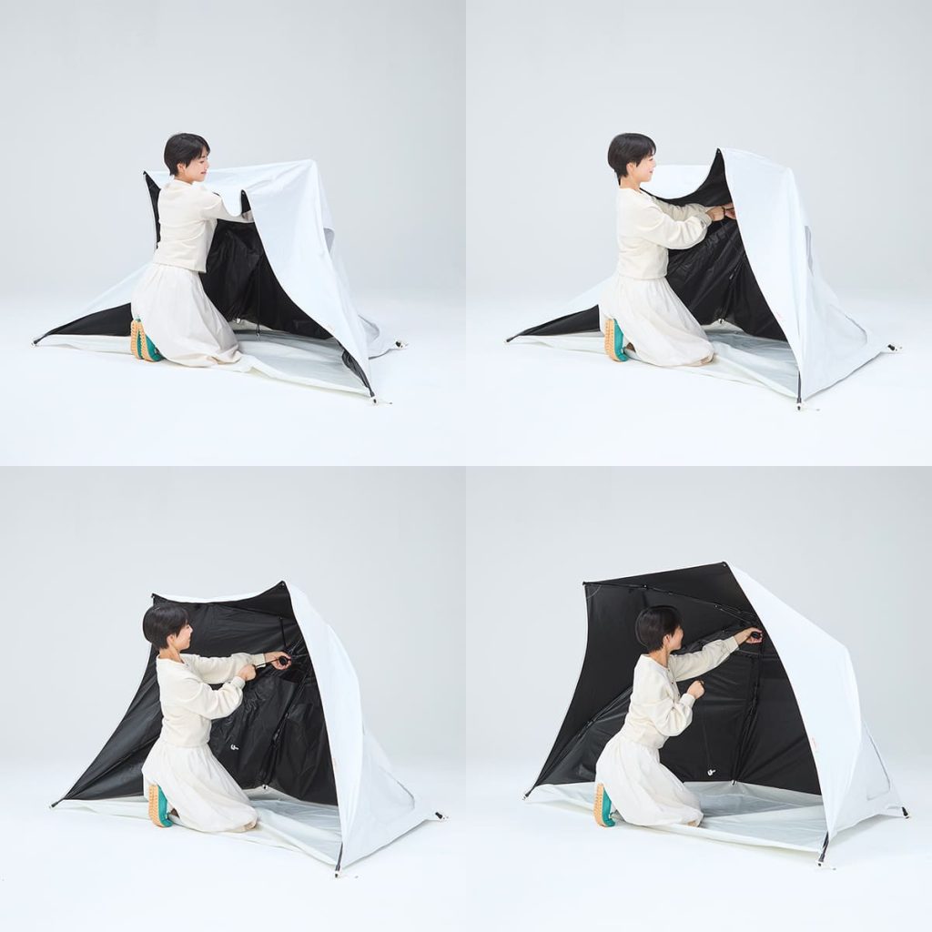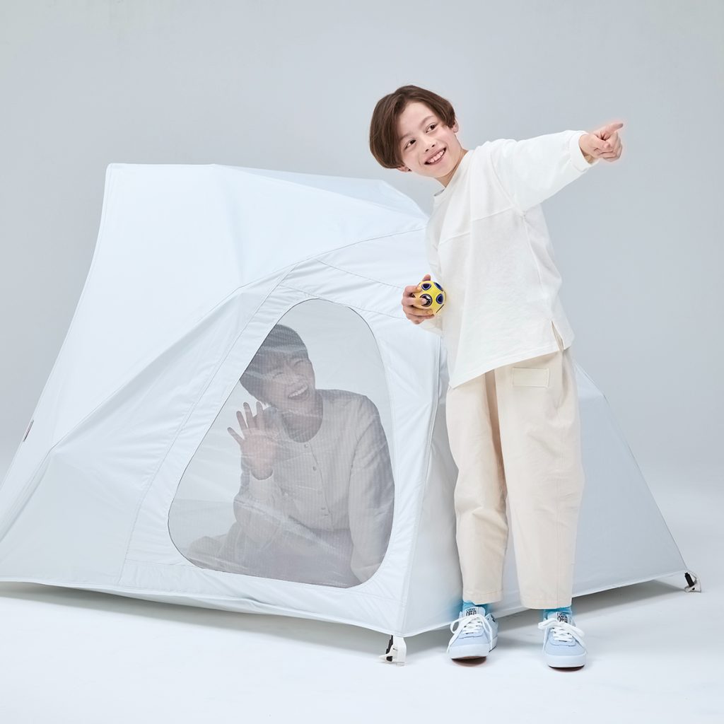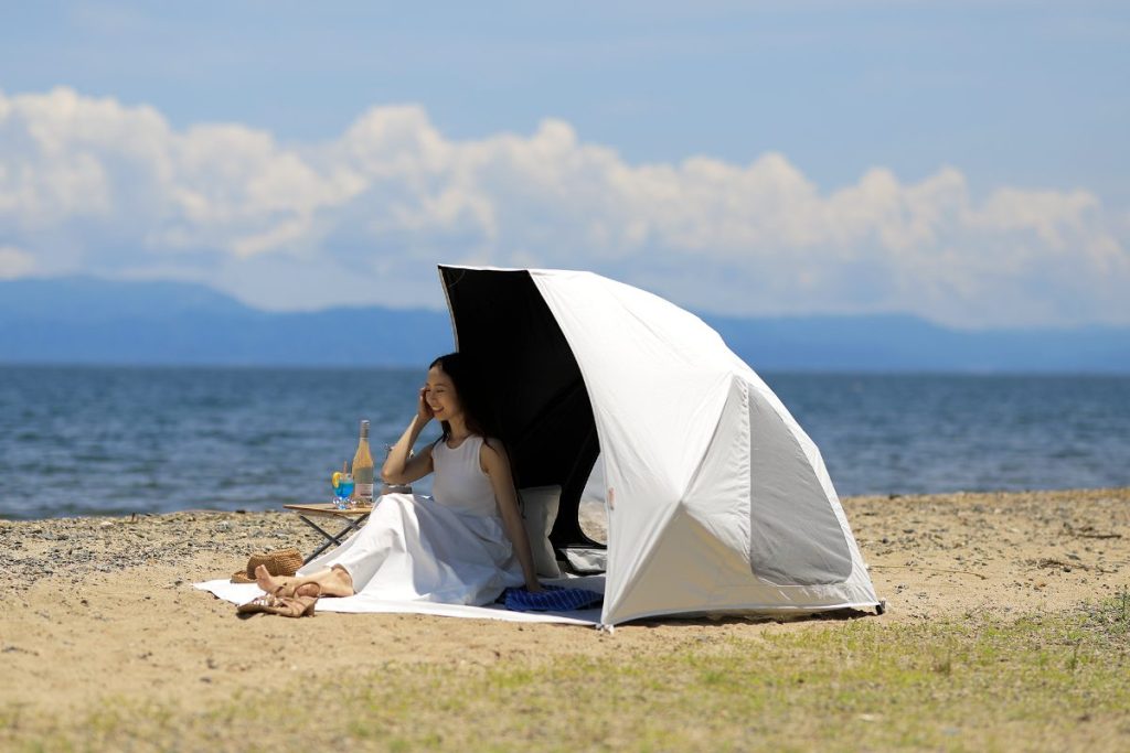 アウトドア用品累計100万台突破のyocabitoが展開する「COCOON」は、傘のように5秒で開くだけで設置できる使いやすさが魅力のドーム型サンシェード。展開サイズは約幅200×奥行き217×高さ110cmと広々としており、窮屈さを感じることなく快適に過ごせます。
