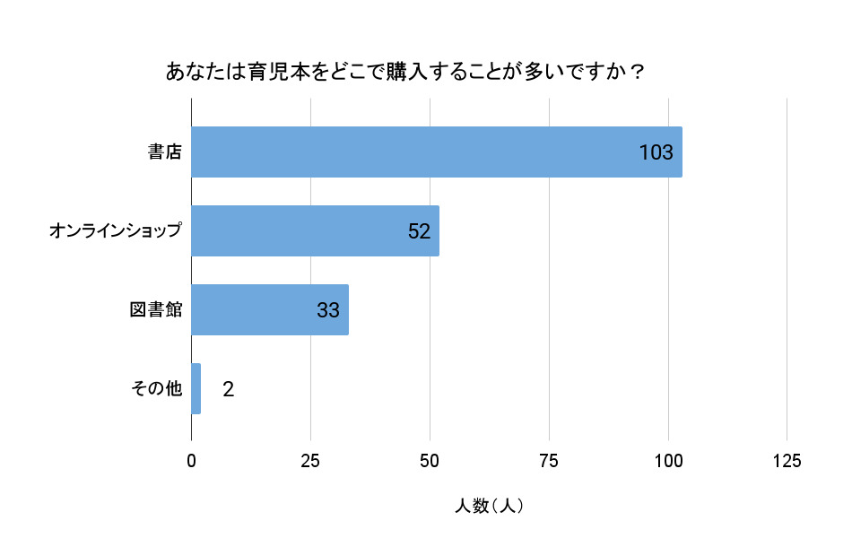 育児本を購入する場所を尋ねたところ、育児本を読む人の半数以上が「書店」(103人)と回答。やはり内容を重視するからこそ、手に取ったり似た本と比べたりして、自分にいちばん必要な本を選びたいという人が多いのかもしれませんね。