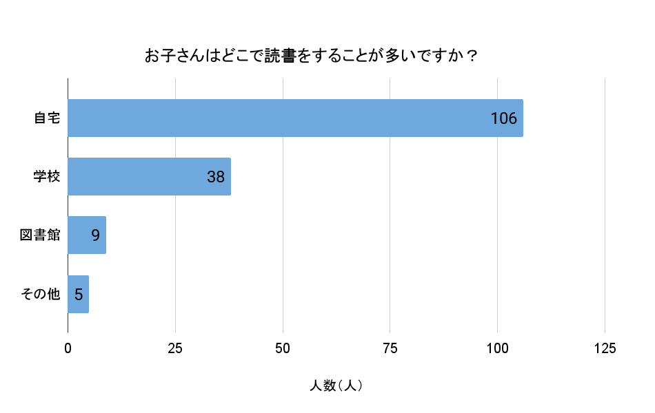読書をする場所を尋ねたところ、「自宅」(106人)、「学校」(38人)、「図書館」(9人)と続きます。読書に親しめる環境が身近にあるのはとてもいいことですよね。