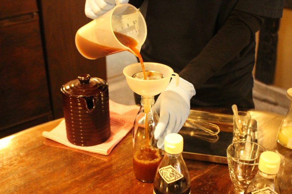 濃厚な出汁に選んだ果汁を入れて、テイスティング。もうちょっと果汁が多いほうが好きだったら、また足していく…、という具合で自分好みのぽん酢を作っていきます。