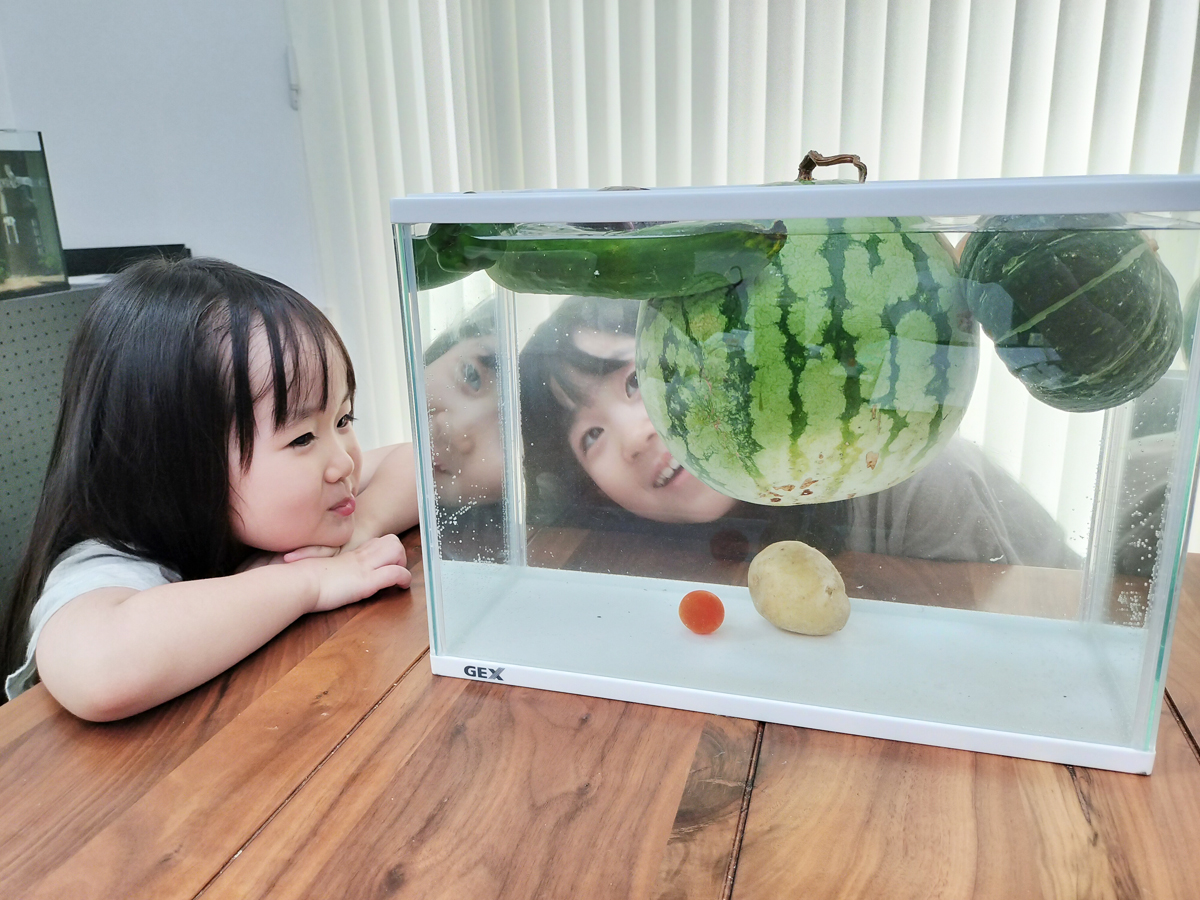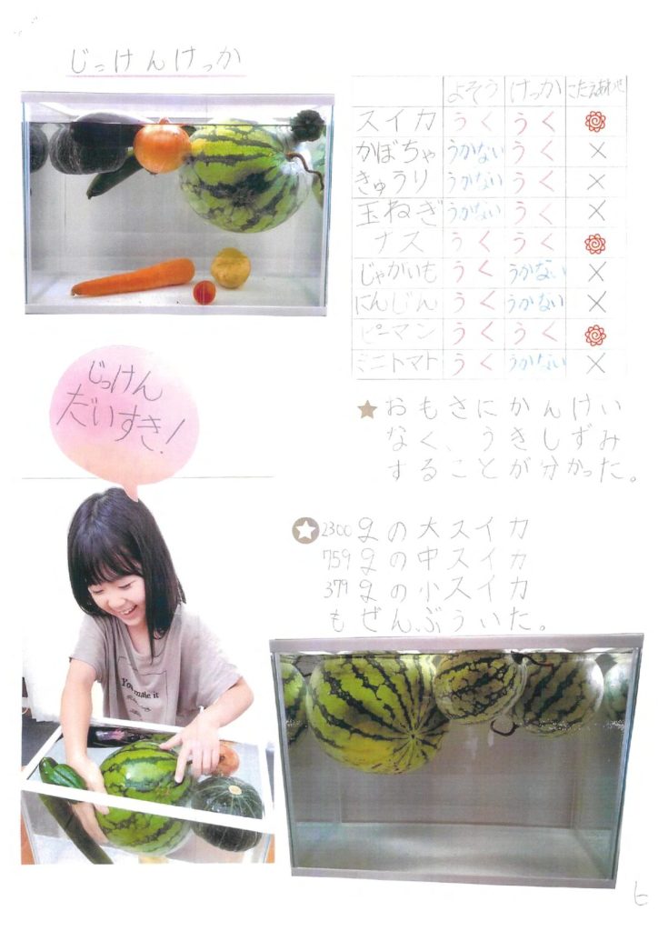 未羽さん:浮くと思っていたものが沈んだりして意外な発見がいっぱいありました。野菜は、土の上で育つものは浮き、土の下で育つものは浮かないことを発見しました。完熟のトマトは沈むけれど、そうではないと浮くという違いにもびっくりしました。