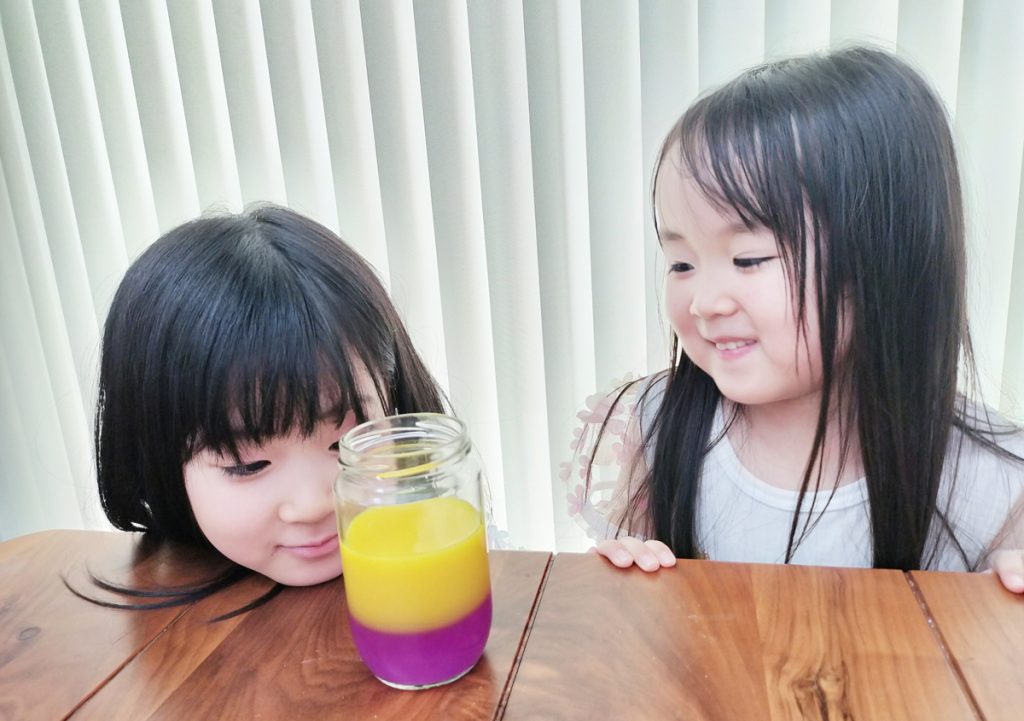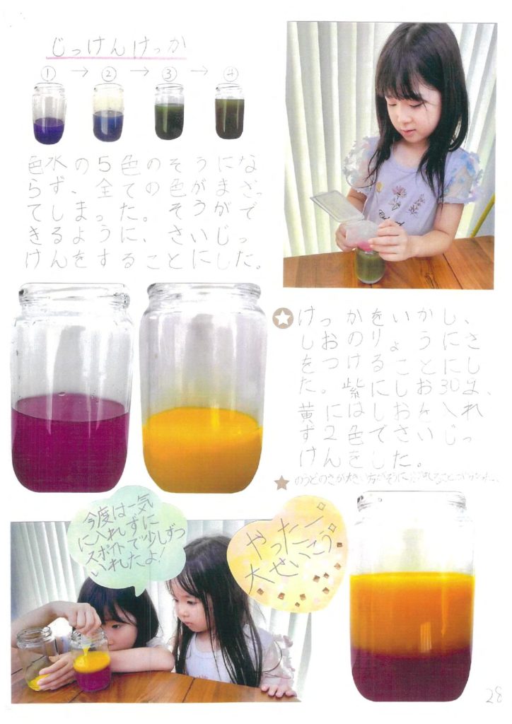 未羽さん:色水の実験です。塩を5gずつ増やしただけでは、5色の層にならず全ての色が混ざってしまったけれど、塩の量を30gにしてたくさんの差をつけたところ、2色の層になり、家族みんなでとても喜んだことを覚えています。失敗することの大切さを学ぶこともできました。