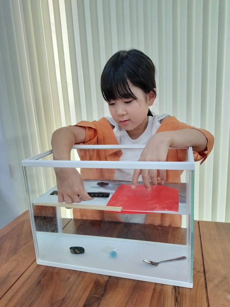 未羽さん:家族でバーベキューをしたときにバケツの水でスイカを冷やしたら、スイカがずっと水に浮いていて、とても驚きました。プールでも、私より重いお父さんは上手に浮くことができて、軽いゴーグルが水の中に沈んだのが不思議だなと思いました。それで、「どうして重いものが浮き、軽いものが沈むのだろう?」と興味を持ち、浮き沈みについて調べてみようと思いました。