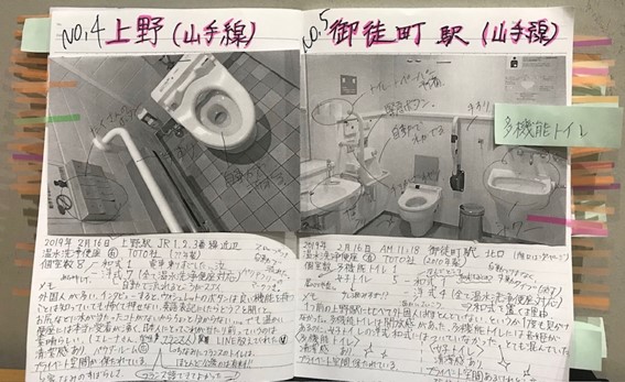 原田さん 帰国するとトイレの実態を調べ、研究を始めました。都内の駅や空港などの公共のトイレを中心に1000カ所くらい回りましたね。どこのトイレにどんな機能が備わっているのか、バリアフリーの設備も含めて、写真を撮ってメモしたものをまとめました。