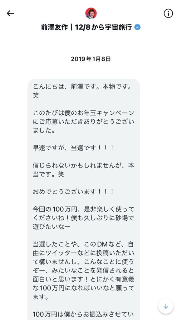 2019年1月に、ZOZO創業者の前澤友作さんが「100人に100万円をプレゼントする」という、総額1億円のお年玉企画を実施されたのを覚えていますか? 実は、あの企画に私、当選したんです!
